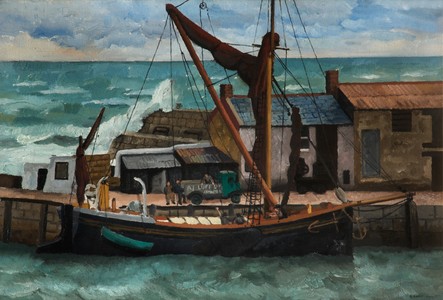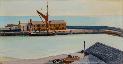 Dorset England Lyme Regis The South West berthed boats ships breakwater buildings calm cement harbour hills masts moored quay rigging sailing boats schooner sea two master warehousesThis painting is well known because it was reproduced as a print by the Medici Society and it proved very popular. The painting was mis-titled "The Mary Eliza, Weymouth" in the 1936 Redfern Gallery exhibition but as we can see from the diary extract below, the ship is in fact berthed at the end of the Cobb in Lyme Regis. We have changed the title accordingly.